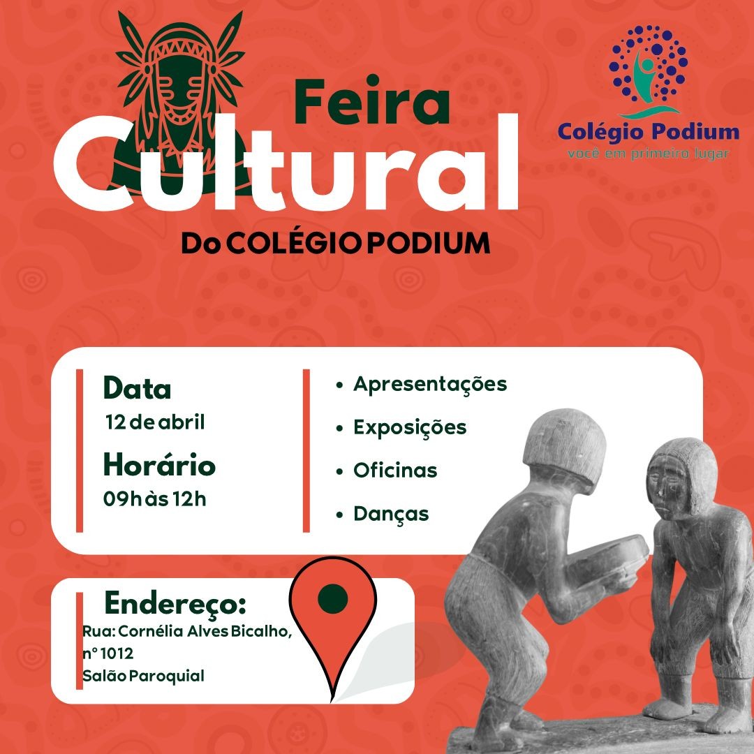 No dia 12 de abril, o Salão Paroquial receberá a Feira Cultural do Colégio Podium, das 8h às 12h. O evento tem como objetivo divulgar a cultura de diferentes regiões do Brasil, por meio de exposições de tradições, costumes, artes e artesanato, além de apresentações de dança e música.