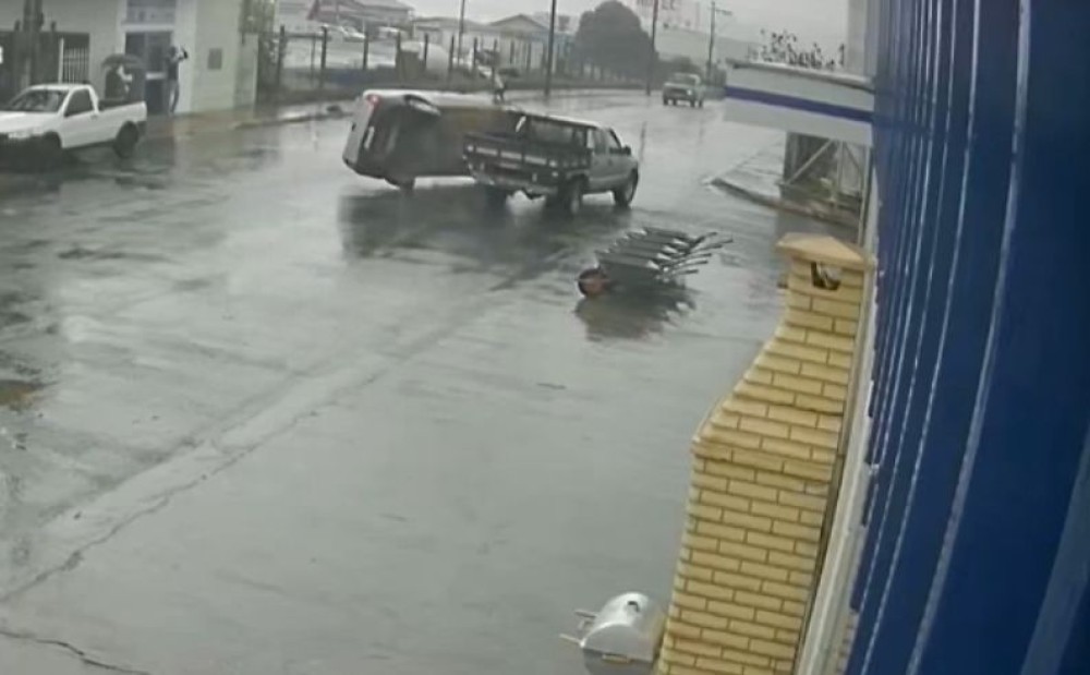Caminhonete tomba após colisão em Campos Altos; acidente é registrado por câmera de segurança