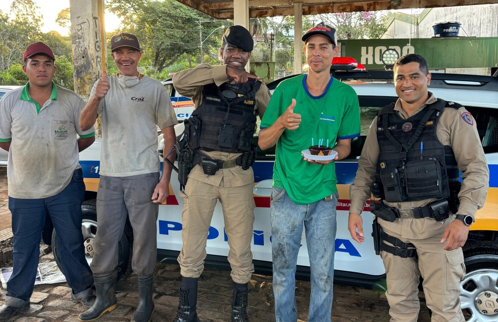 Admirador da Polícia Militar é homenageado por policiais em seu aniversário, em Campos Altos