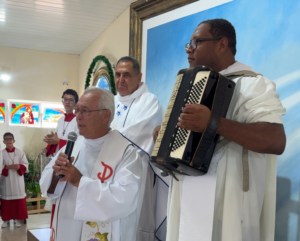 Vídeo: 'Padre sanfoneiro' canta com fiéis durante Encontro de Folias de Reis no Santuário Diocesano em Campos Altos